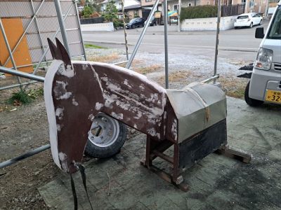 木部の劣化が進行しており、特に軒天の木板表面がボロボロなので、取り換えたいところでしたが、交換するにも一般住宅と違って簡単にはいかず施工に悩みました。試験施工してみたところ、表面が劣化した軒天ベニヤ面は下地処理を工夫して、塗れるレベルにまで綺麗にできました。穴の開いたところは、ベニヤを曲げながら上から重ね張りして対応することに。 穴あきは数か所でしたが、曲面のためぴったり貼るのが大変で大工さんにはご苦労かけました。 日当たり面の木部は日焼けして吸い込みも激しい状態になっておりました。劣化するとどうしても色が乗りずらくなるのですが、塗りつぶしタイプの木材保護塗料を使用すると綺麗に着色することが出来ます。 正面の彫刻もすっかり蘇って喜んで頂けました。