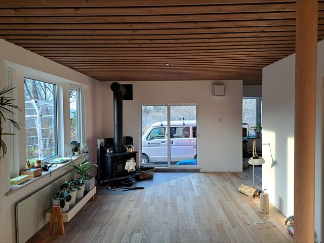 無垢のフロアーと白い壁、薪ストーブといい感じに仕上がりました。